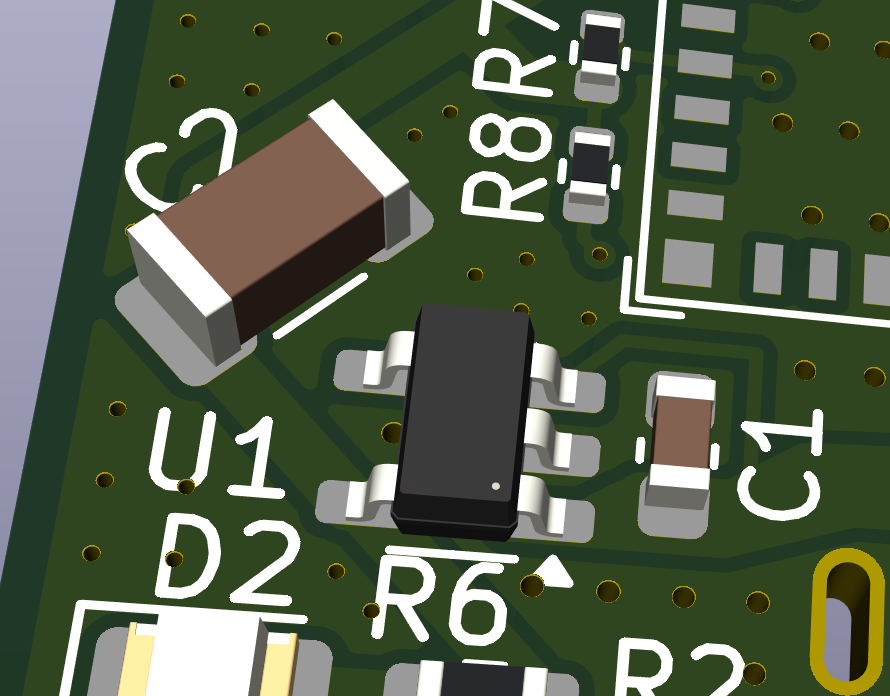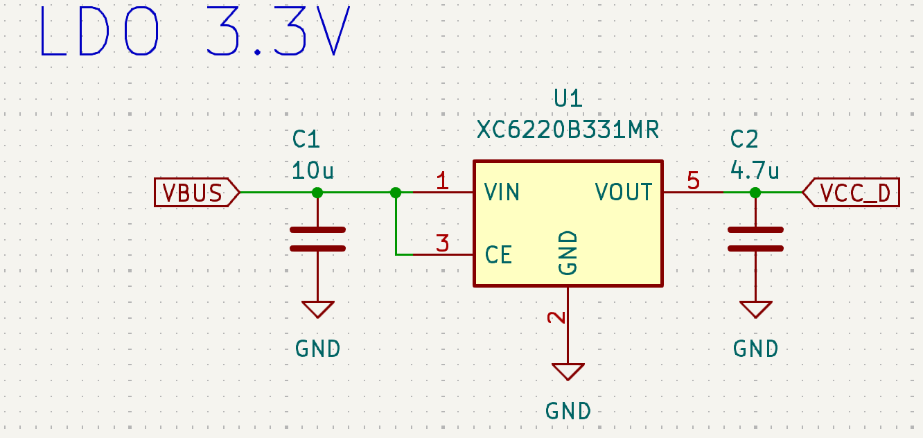 USB 5V電源から安定して動作させるため、大電流対応のLDOレギュレータ XC6220B331MR を採用しました。