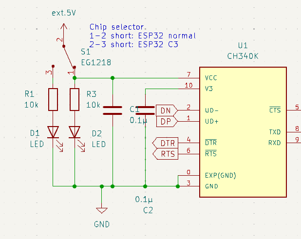 ESP32C3に書き込む場合はシリアル変換をかませる必要がないのでCH340K自体への電源供給をしないようにします。