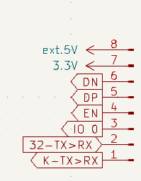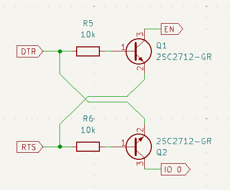 CH340KからのDTR, RTS信号を次のように接続することでプログラムをアップロードする時に自動で書き込みが行われます。