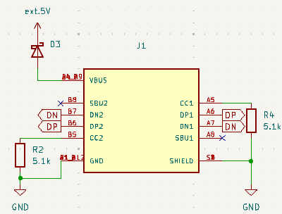 typeCコネクタのDN(D-), DP(D+)を使って通信をします。CC1,2を5.1kohmでプルダウンすることでVBUSから5Vが供給されます。